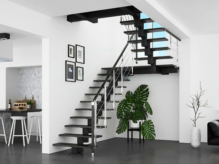 Model Knock to schody na centralnej konstrukcji modułowej, stworzone z myślą o maksymalnej elastyczności projektowej. Spawana konstrukcja z profili stalowych pozwala dopasować schody do niemal każdej przestrzeni - również tam, gdzie liczy się każdy centymetr.